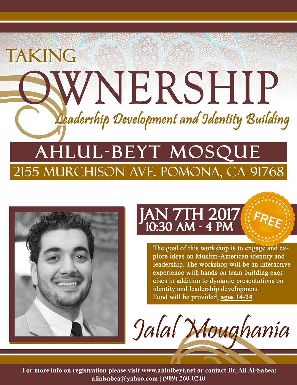 As-Salaamu Alaykum! Ahlul-Beyt (as) Mosque cordially invites you to the Emotional Intelligence: Akhlaq and Effective Relationships workshop with Hajj Jalal Moughania. This workshop is limited to all youth from 14-35. Food and refreshments will be provided.