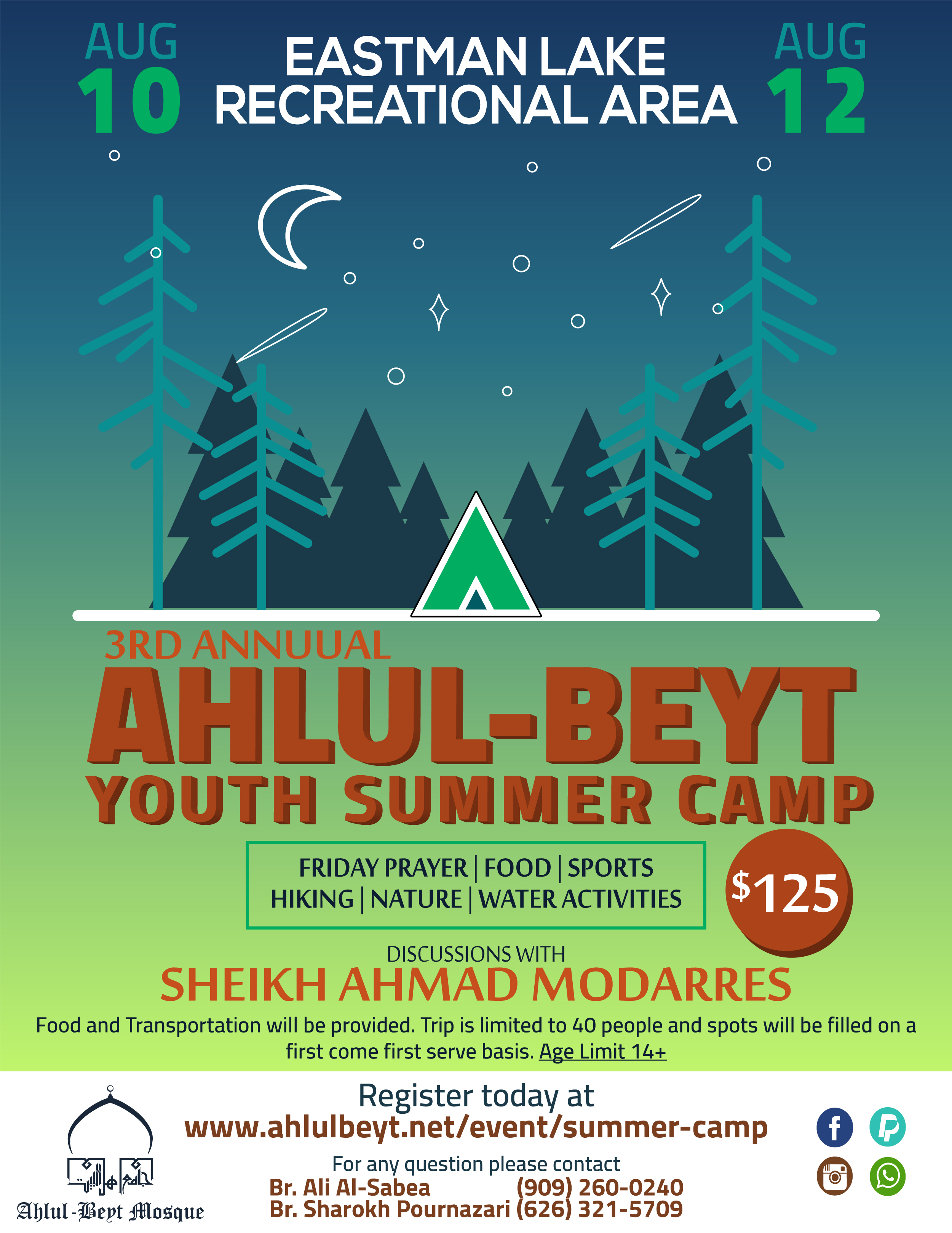 As-Salaamu Alaykum! It's that time of year again! Ahlul-Beyt (as) Mosque would love to be able to host you for the 3rd Annual Youth Camp. Join us for a weekend of spirituality and fun at Eastman Lake, CA where we have very special camp planned out. There will be many activities to enjoy, including but [...]